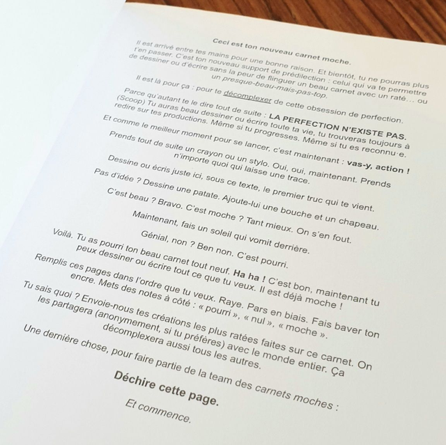 La page de garde propose un petit rituel pour briser immédiatement la perfection du carnet neuf.