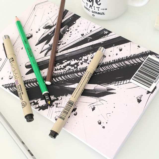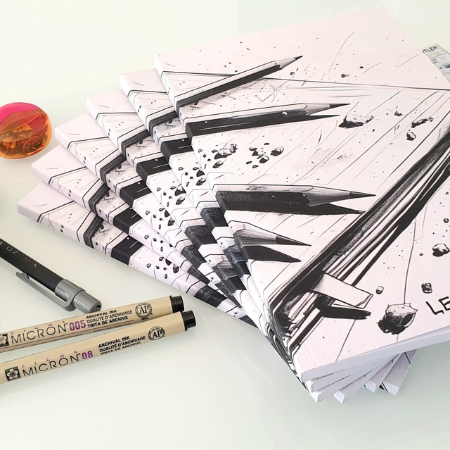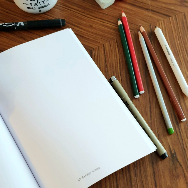 Caractéristiques : impression N&B, papier blanc 80 g, couverture mate. Compatible crayons, stylos, feutres fins (alcool et aquarelle déconseillés). Pied-de-page discret rappelant l’esprit du carnet.